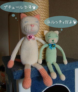 プチ・ムッシュファミリー♪ ・ プチムッシュ氏の名付親Monsieur氏との話から「独りでは淋しいのでは?」と候補となった名前を生かし家族計画が出来る。 ・ ちょうどプチュールを編み上げた頃、 突然、従妹よりユルッチィが養子に来る こととなる。 ・ 3月15日、いきなりプチムッシュ氏に 嫁さんと子供が出来てしまう。 ・ お似合いの家族とブログ仲間で評判 となるが、優若は唐突な展開に困惑。 ・ブログの重要登場人物となっている。 |