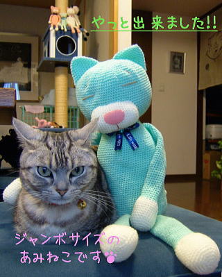 巨大あみねこ出現!! ・ お義姉さんの「抱っこサイズのあみねこ ほしいわ〜」に触発され編んでしまい ました。 ・ 優若の頭より大きなあみねこの頭に 優若は困惑気味。 ・ジャンボ あみねこは、今お義母さん の家で毎日みんなを癒してくれてます。 |