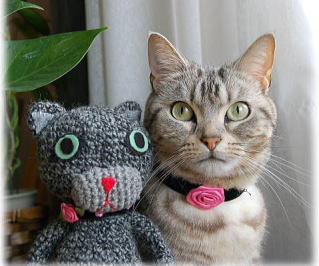 優若そっくりのあみねこです♪ ・うにゃママの従妹が、優若のコンテスト 優勝記念に優若モデルのあみねこを 作ってくれました。 ・ポイントはもちろんグリーンのぱっちり お目目。 ・薔薇のチョーカーもおそろいで、 優若はビックリして見つめてます。 ・記念撮影もばっちり決まりました♪ |