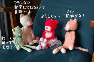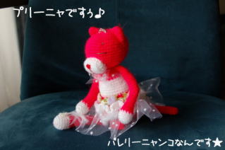 バレリーニャンコ登場♪ ・花火大会に来てくれた従妹が編んで、連れて来てくれました あみねこのバレリーナです。・ピンクのボディに白いチュチュが決まってます。ちゃんとトウシューズも履いているんです。 早速、「プリーニャ」と名づけました。 ・話してみたら、プチムッシュの従妹で、フランスに留学してたんですって! |